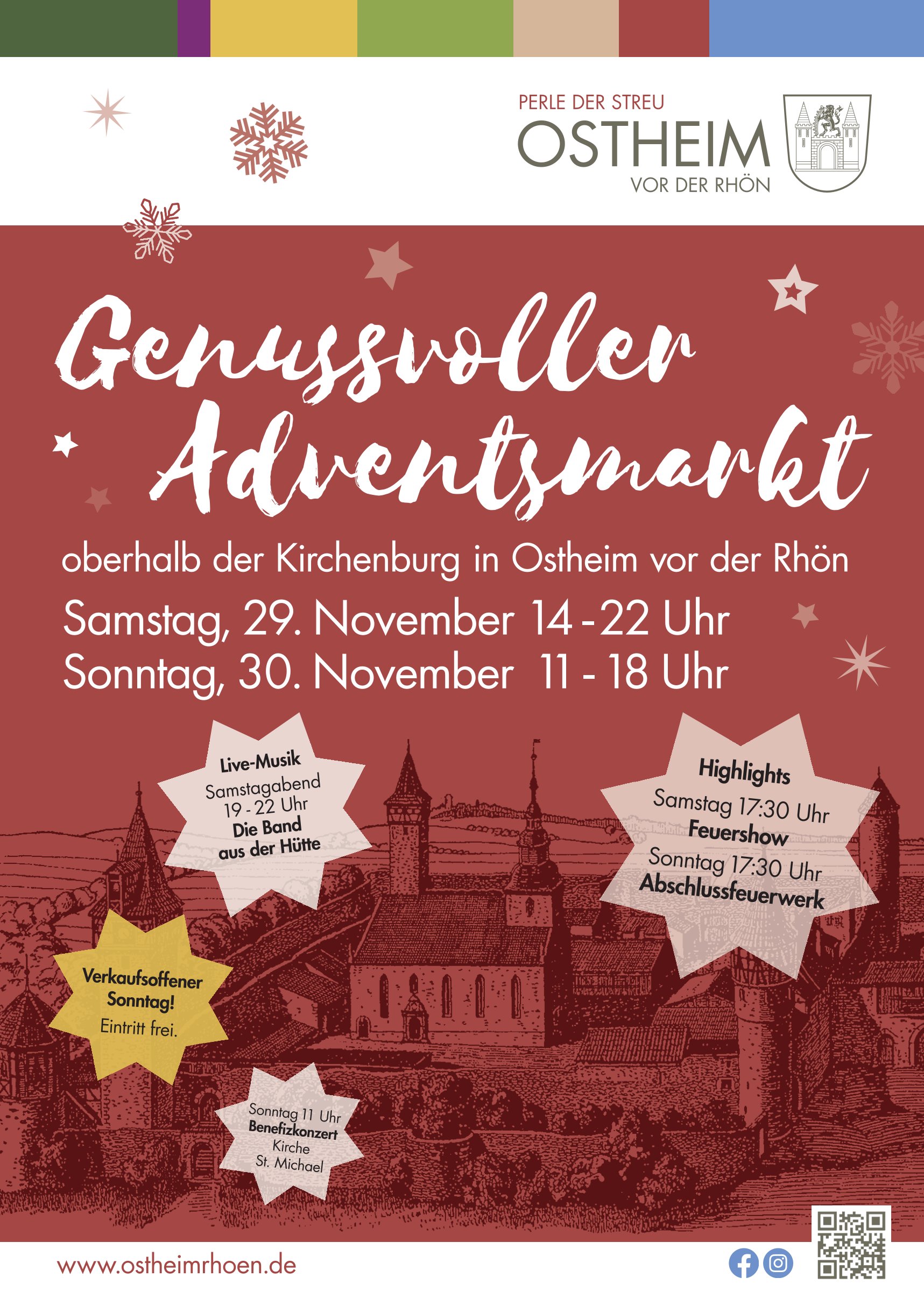 Adventszauber in Ostheim! Am 1. Adventssamstag, 29.11.2025 eröffnet um 16 Uhr das Ostheimer Christkind den stimmungsvollen Adventsmarkt oberhalb der Kirchenburg. Samstagabend sorgt eine Feuershow und das anschließende Konzert der „Band aus der Hütte“ für beste Laune. Der Sonntag startet mit einem Benefizkonzert für das Kinderheim Nicolhaus. Freuen Sie sich auf Musik, Leckereien und echte Adventsstimmung! Der genussvolle Adventsmarkt ist am Samstag, 29. November von 14 bis 22 Uhr und am Sonntag, 30. November von 11 bis 18 Uhr, geöffnet. Der Eintritt ist frei.