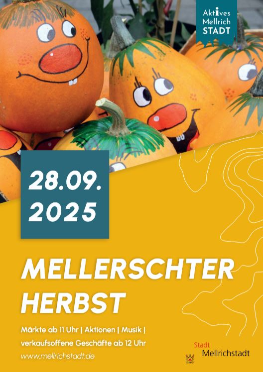 Mellerschter Herbst mit Händler-, und Flohmarkt. Dazu gesellen sich Kulturangebote und weitere Aktionen wie Herbstfest im Museum, Ernte-Dank an der Kelter und nicht zu vergessen die große Modellbahnschau in der Oskar- Herbig-Halle (Samstag und Sonntag). Darüber hinaus haben viele Geschäfte verkaufsoffen und laden zum Einkaufsbummel ein.